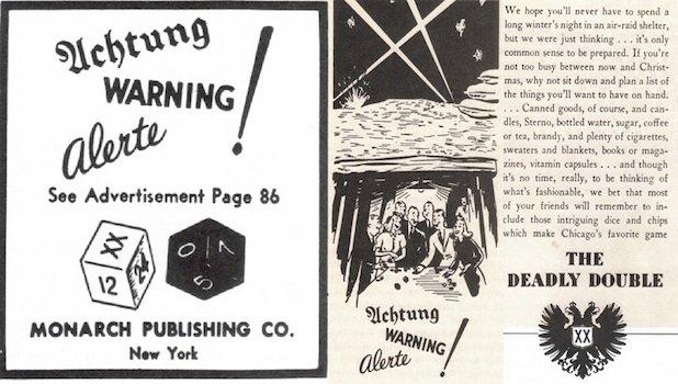 1941年11月22日,珍珠港事件发生前两周,《纽约客》杂志刊登了一则奇怪的广告。照片上的人躲在防空洞里,写着“小心、警告!”并推出了一款骰子游戏,名为“致命双骰子”(death Double)。