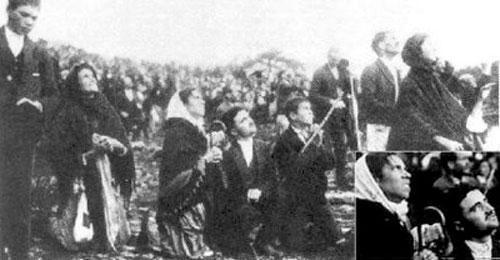 太阳的神迹 在1917年的10月13日,大约三到十万人聚集在葡萄牙的法蒂玛小镇,来观看由三名小孩所预言的神迹。来到法蒂玛的人们称他们看见,头顶上的乌云中钻出了一个转动的圆盘,它将彩色的强光投射到围观群众身上,然后消失得无影无踪。 这个现象持续了十分钟,后来有些人称他们在光芒中看见了圣母玛利亚。
