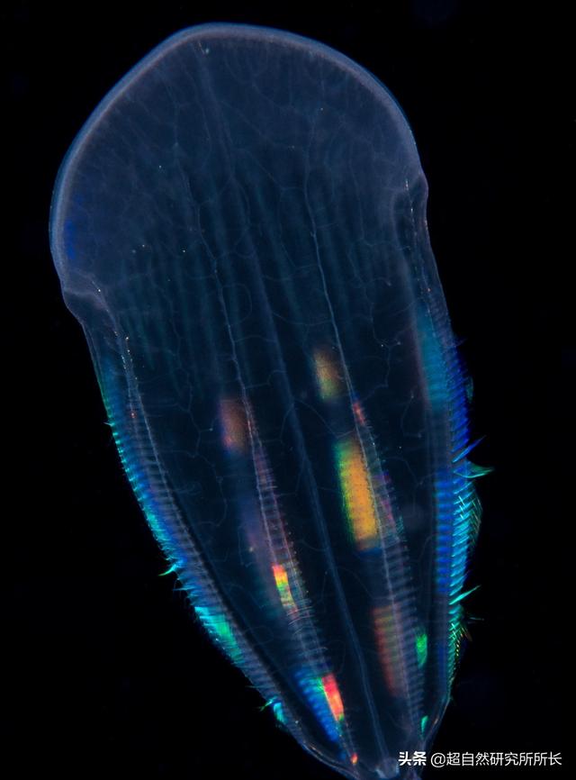 这时,黑暗中又出现了别的东西,一只瓜水母,一个自带LED灯的生物,成排的细小毛发在它全身运动,很漂亮不是吗?