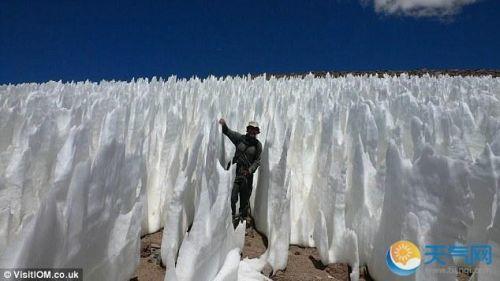 11、这种遍地冰钉的自然奇观被称为“忏悔者”。在高海拔气候恶劣的地区,阳光照射在积雪表面上,随机留下了凹陷痕,没有凹陷的地方对阳光反射作用更强,不易融化,而有凹陷的地方则会加速融化,久而久之,形成了这些冰铸的“钉子”。